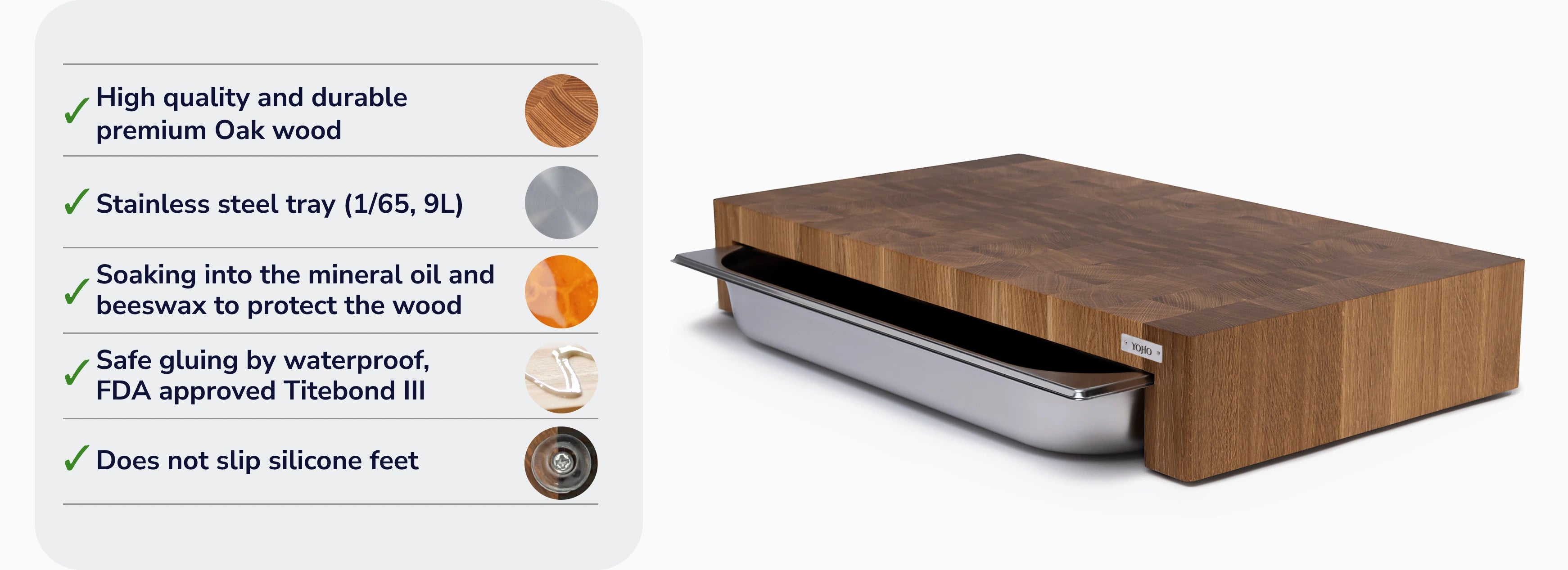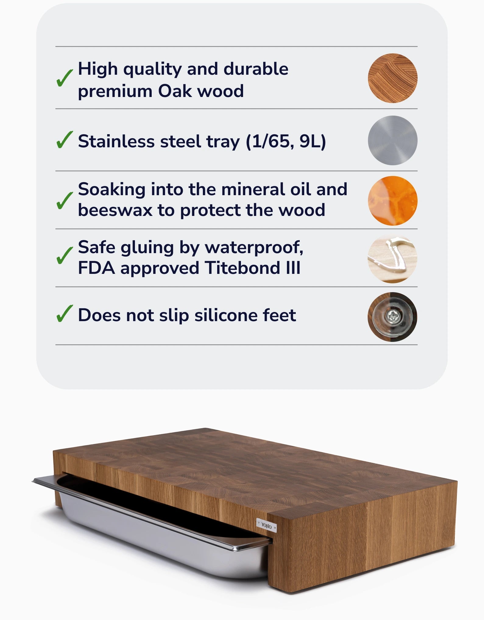 Additionally, oak's end grain surface is highly resistant to chopping and cutting, ensuring that the board remains smooth and resilient for many years with proper maintenance.