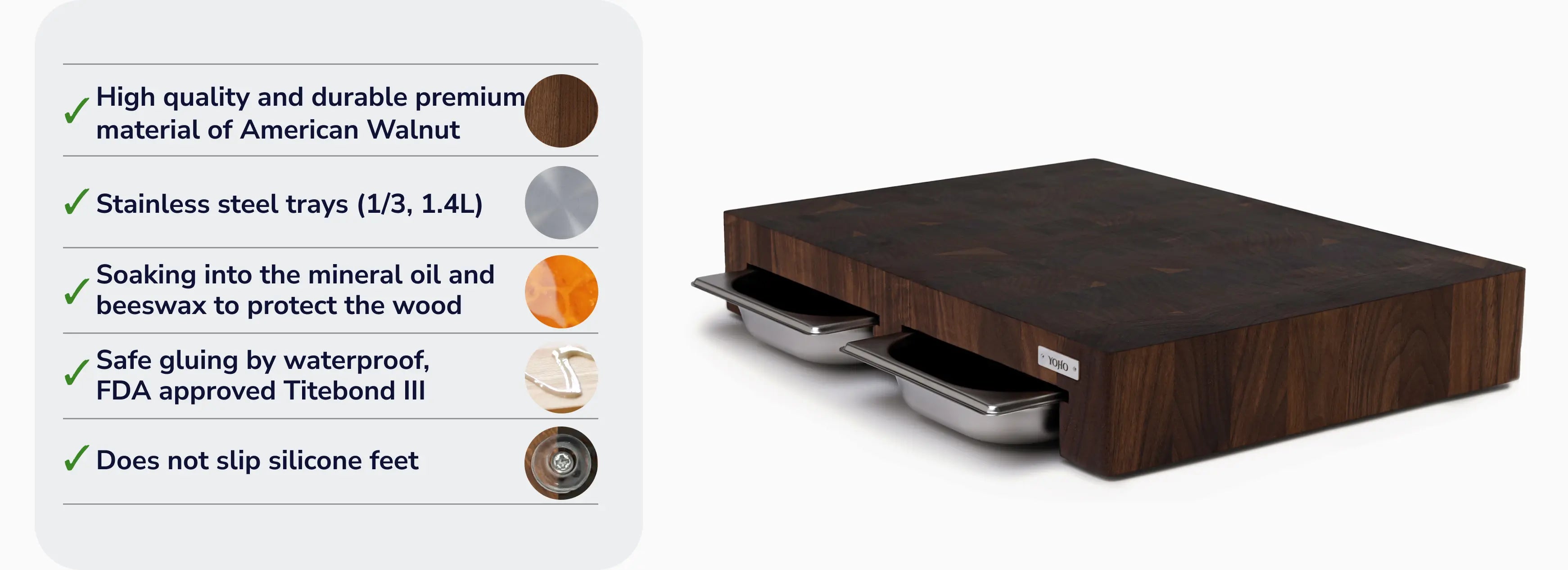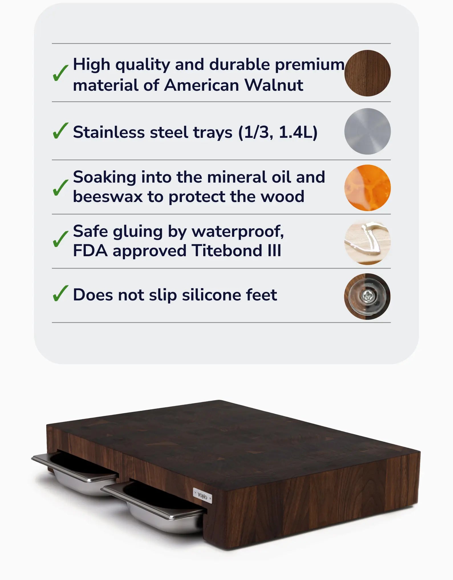 Our cutting board with built-in tray keeps your kitchen clean, your process organized, and your mind clear. Easier cleanup — becomes something you look forward to.