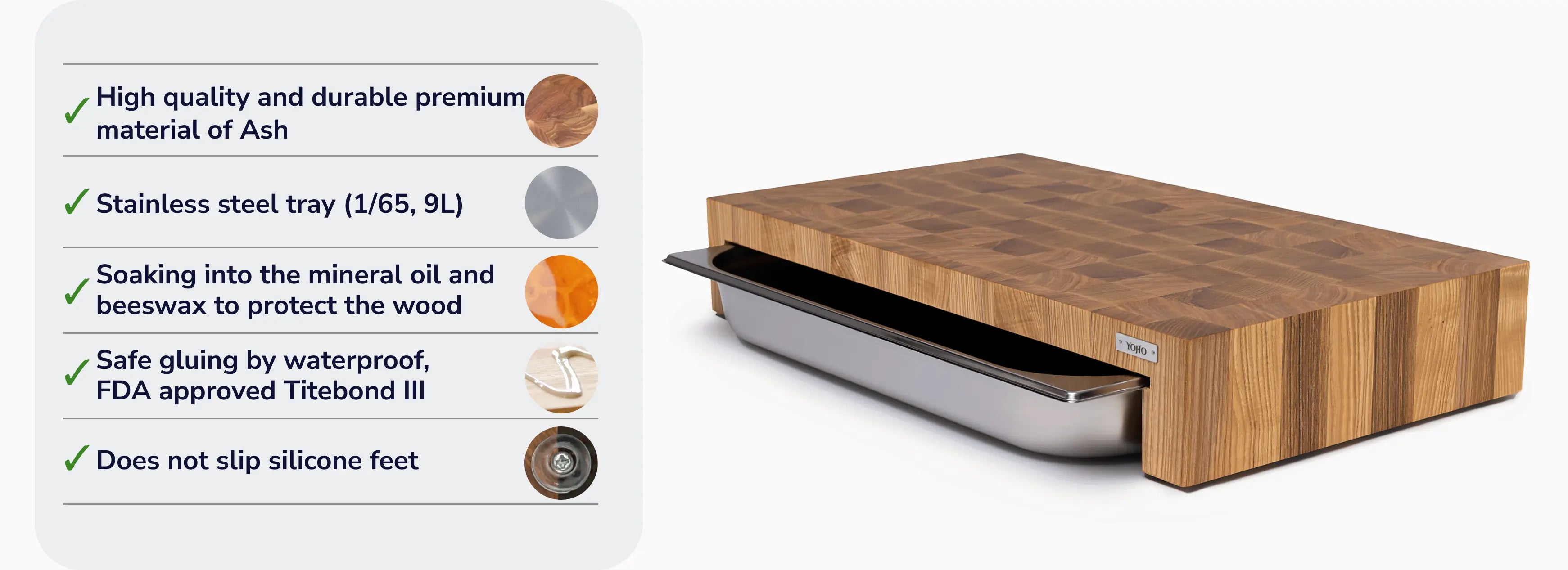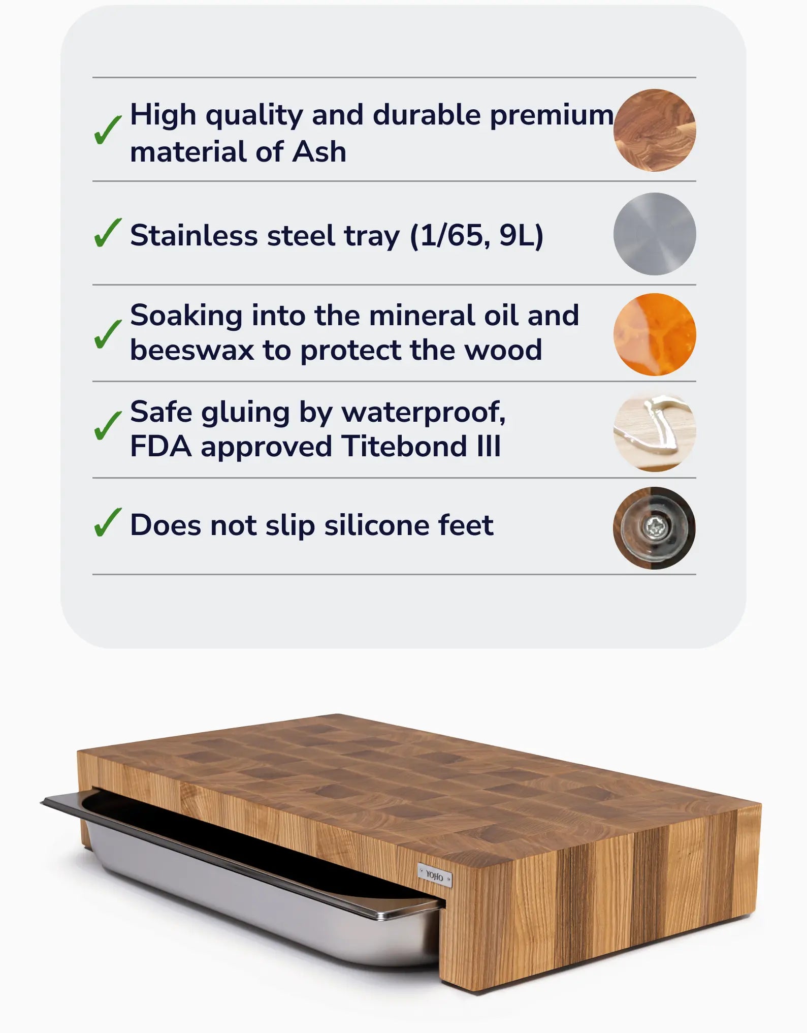 Our cutting board with built-in tray keeps your kitchen clean, your process organized, and your mind clear. Easier cleanup — becomes something you look forward to.